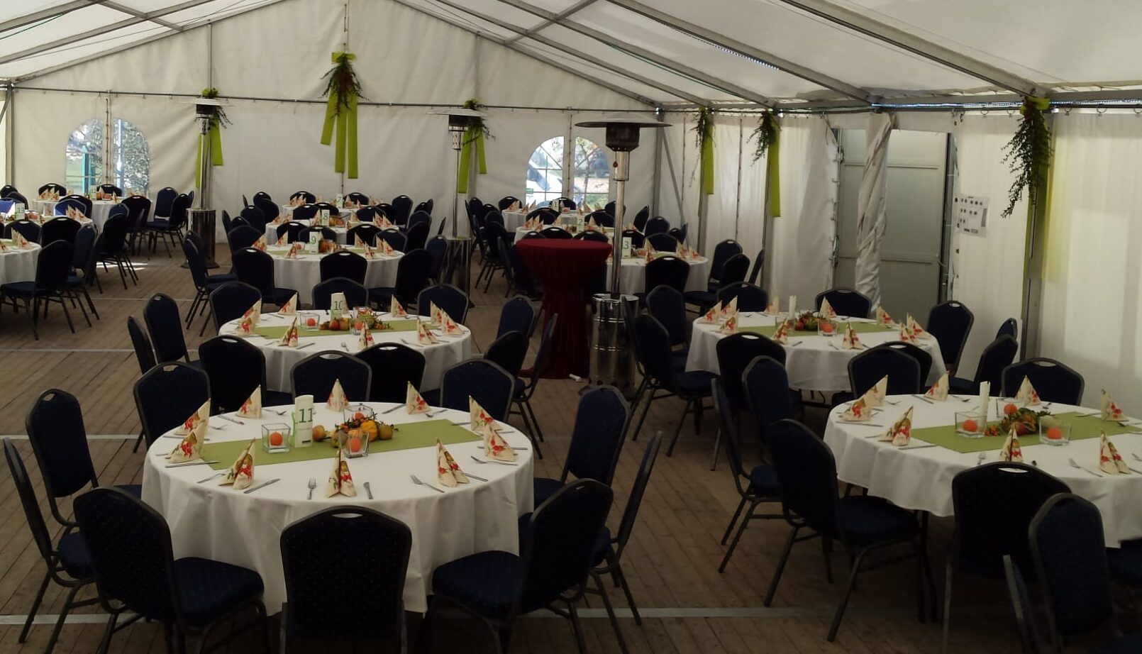 Unsere Festzelte schaffen eine stilvolle Atmosphäre, mit Platz für Gäste, Tanzfläche, Buffet und festliche Bestuhlung.