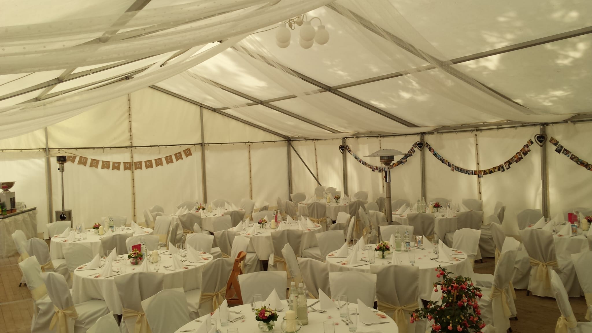 Ein echtes Festzelt für besondere Anlässe. Stabiler Holzboden mit Platz für Tanzfläche, Tische und Buffet. Ideal für Hochzeiten oder Firmenfeiern. Für ca. 120 Personen.